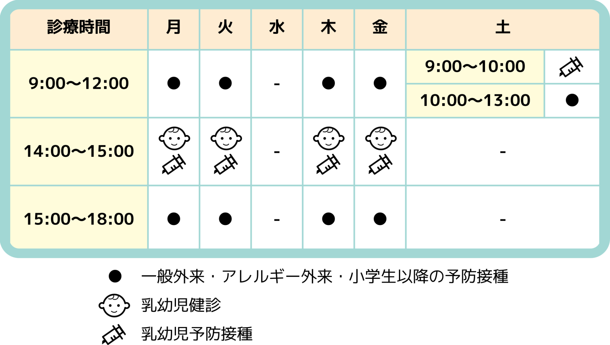 平日 14:00~15:00/15:30 乳幼児健診・予防接種